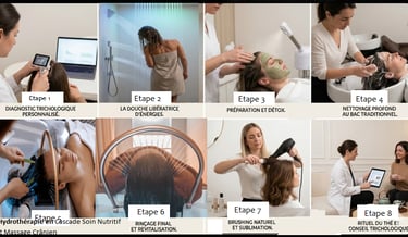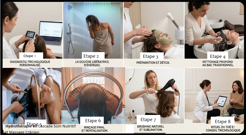 Étape 5 : Immersion Head Spa. Hydrothérapie en Cascade Soin Nutritif et Massage Crânien pendant l’hydrothérapie. Une fois le cuir chevelu purifié, le client est installé dans l'espace Head Spa. Ici, nous utilisons une hydrothérapie avec des cascades d'eau purifiée et déminéralisée. L'absence de minéraux agressifs (calcaire, chlore) prévient l'oxydation de la fibre. L'eau en cascade stimule la microcirculation sanguine par un massage mécanique doux, favorisant l'apport de nutriments vers le bulbe pileux. un conditionneur nutritif naturel, adapté lors du diagnostic initial, est appliqué sur les longueurs. On intègre alors des techniques de massage comme le massage Kobido ou des pressions cervicales pour libérer les tensions musculaires et optimiser l'absorption des actifs. L'utilisation de la vapeur peut être ajoutée pour ouvrir les écailles du cheveu et permettre une pénétration profonde des nutriments.